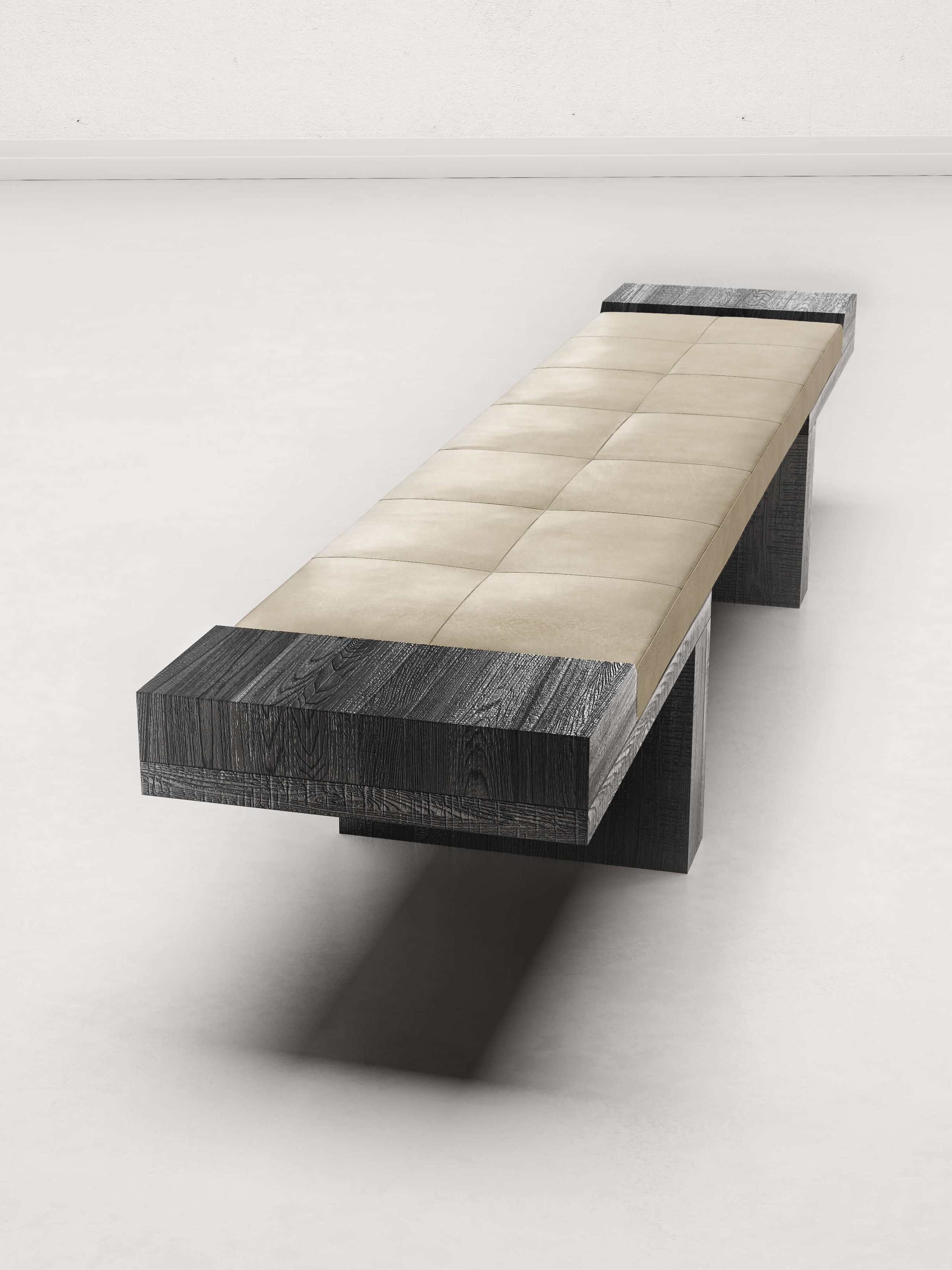 The bench “After All” embodies pure material inspiration throughout. River fir, in all its natural, rough beauty, hosts a padded leather seat, characterized only by a visible double-stitch seam reminiscent of capitonné, but without buttons.