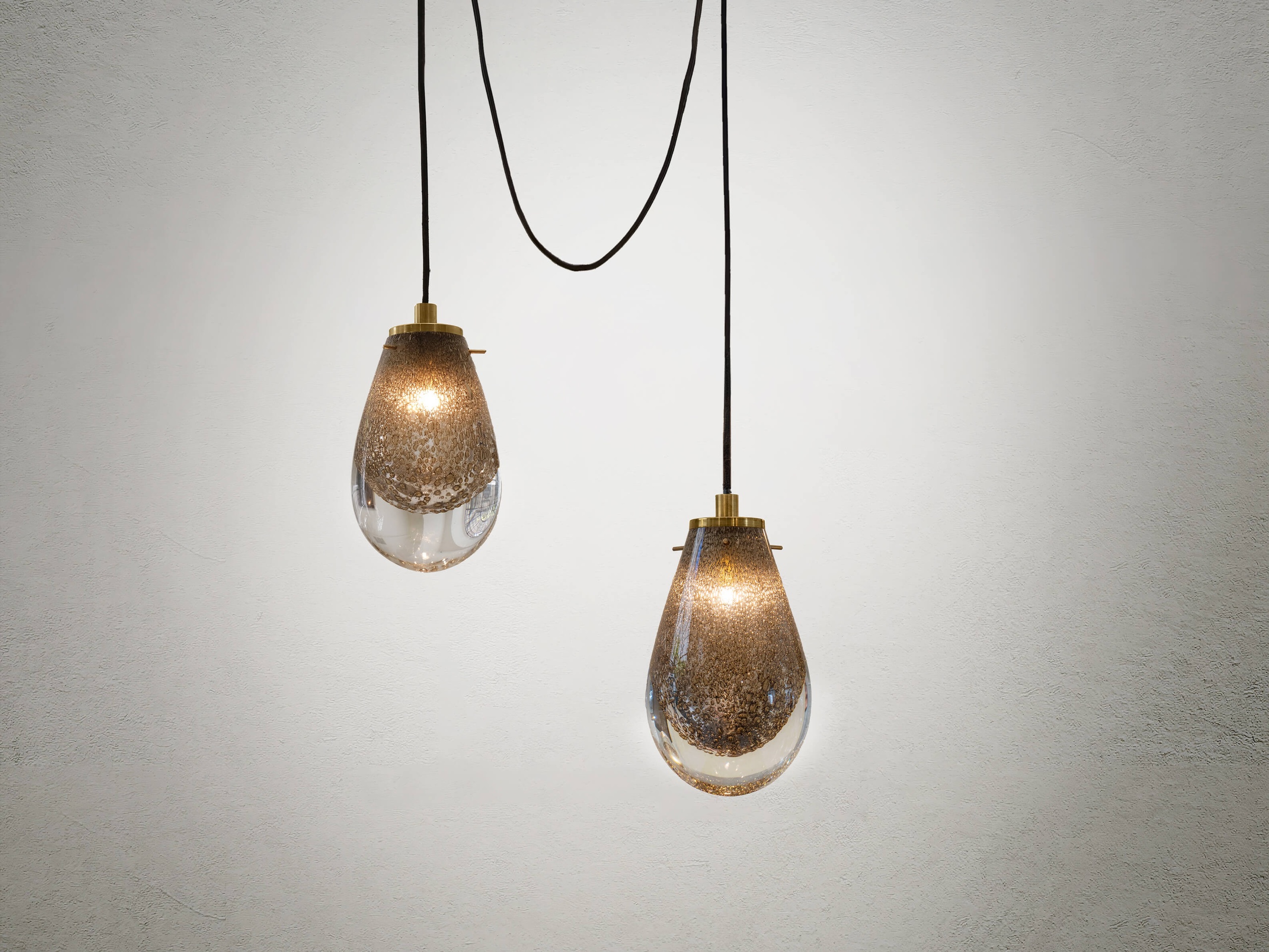 The process begins with a layer of blown glass covering a smaller internal sphere, akin to a delicate embrace. Then, the glass is placed on a platform and immersed in brass dust debris, which adheres to the surface like precious memories that shape our essence. This layer of glass is then manually sculpted, taking on the form of a droplet, symbolising rebirth and transformation. During this phase, the heat triggers a reaction with the brass, trying to burst out while remaining trapped between the layers of glass, forming bubbles that float within it.