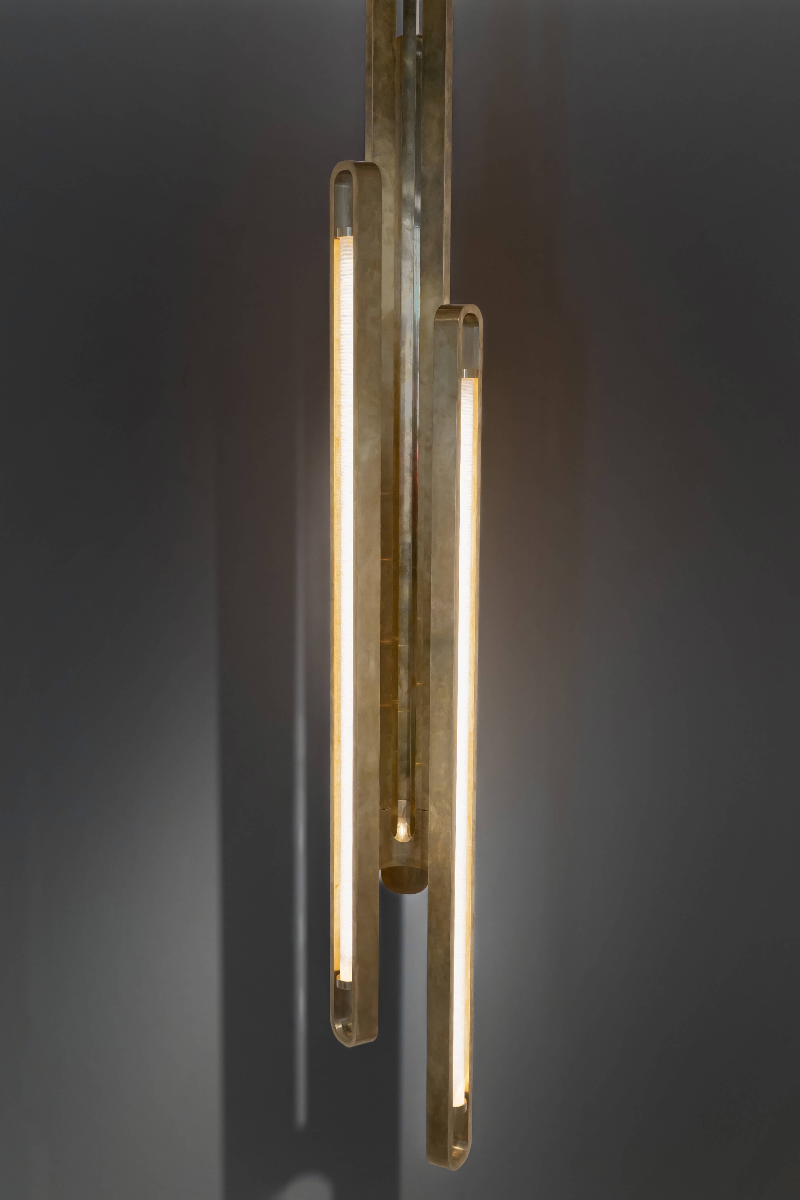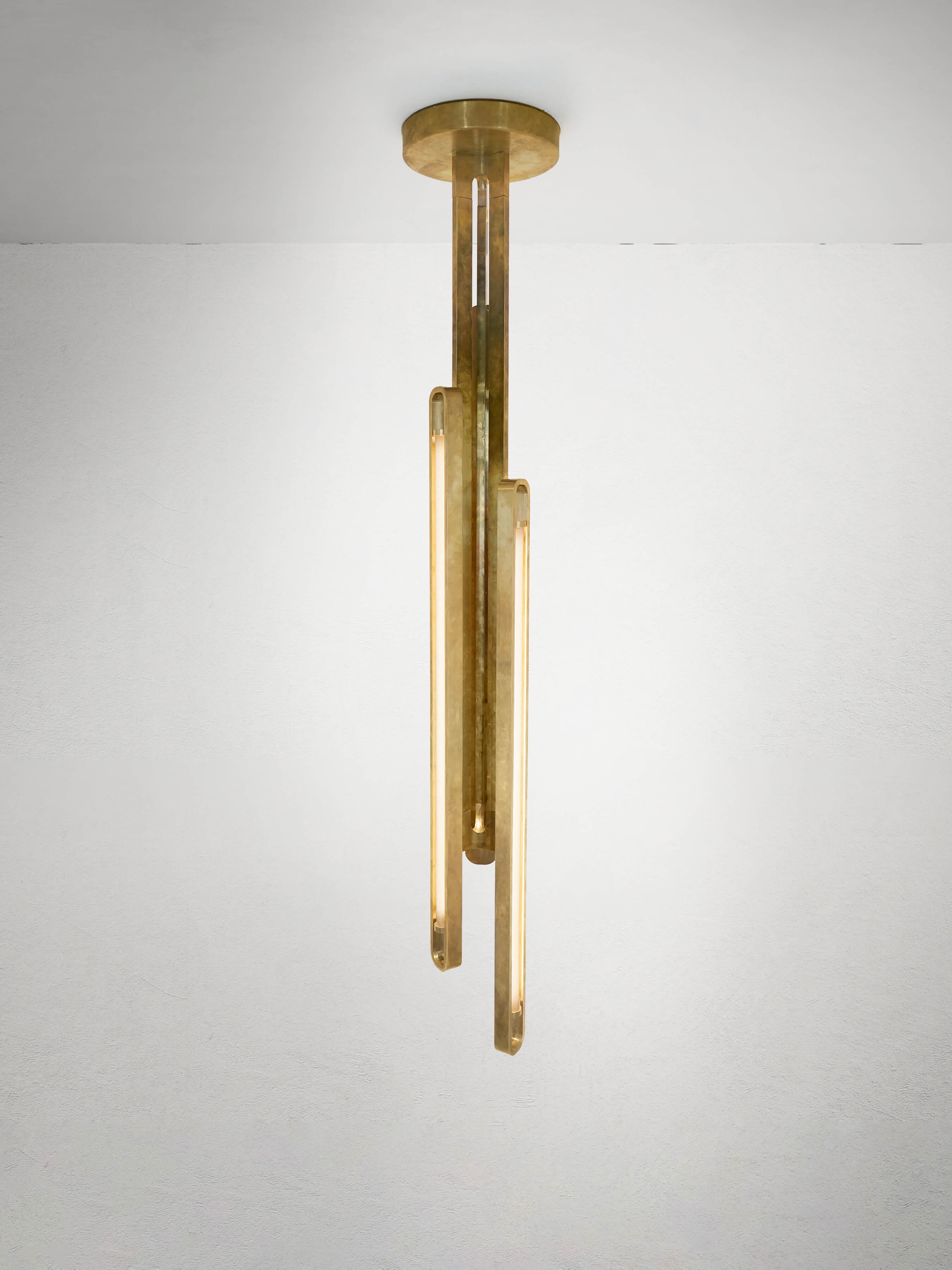 Crafted entirely from solid brass, each element radiates a potent and unmistakable energy, evoking the rebellious spirit of rock ‘n’ roll. The polycarbonate tube is encased in fabric, creating a contrast with the solidity of the brass. The light diffuses, casting an aura of warmth and intimacy. An invitation to explore the darkest and most mysterious nuances of our soul.